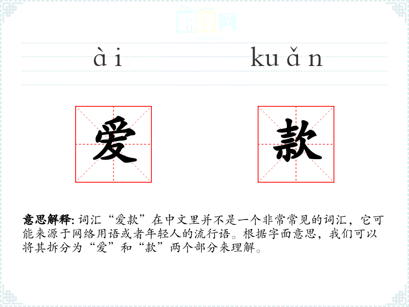 词汇“爱款”在中文里并不是一个非常常见的词汇,它可能来源于网络用语或者年轻人的流行语。根据字面意思,我们可以将其拆分为“爱”和“款”两个部分来理解。