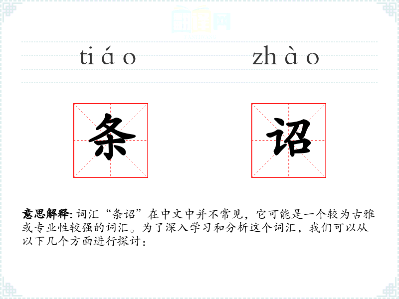 - 反义词:无(由于“条诏”是一个特定且不太常用的词汇,其反义词不明显)