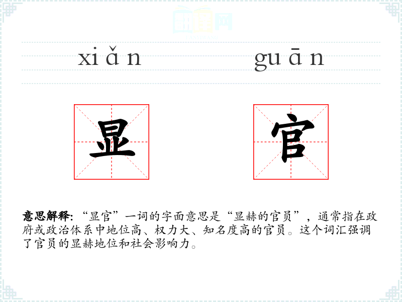 “显官”一词的字面意思是“显赫的官员”,通常指在政府或政治体系中地位高、权力大、知名度高的官员。这个词汇强调了官员的显赫地位和社会影响力。