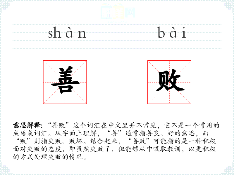 由于“善败”不是一个传统的中文词汇,它的词源和演变不太清楚。它可能是现代人在讨论失败和成功时创造的一个新词,用以强调积极面对失败的重要性。