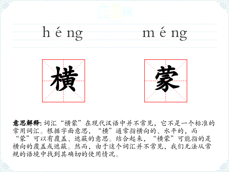 - 由于“横蒙”不是一个常用词汇,它在文学、口语、专业领域等语境中的使用非常有限,甚至可能不存在。