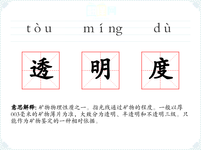 矿物物理性质之一。指光线通过矿物的程度。一般以厚003毫米的矿物薄片为准,大致分为透明、半透明和不透明三级。只能作为矿物鉴定的一种相对依据。