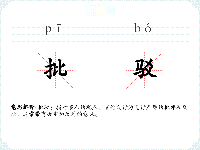 批驳:指对某人的观点、言论或行为进行严厉的批评和反驳,通常带有否定和反对的意味。