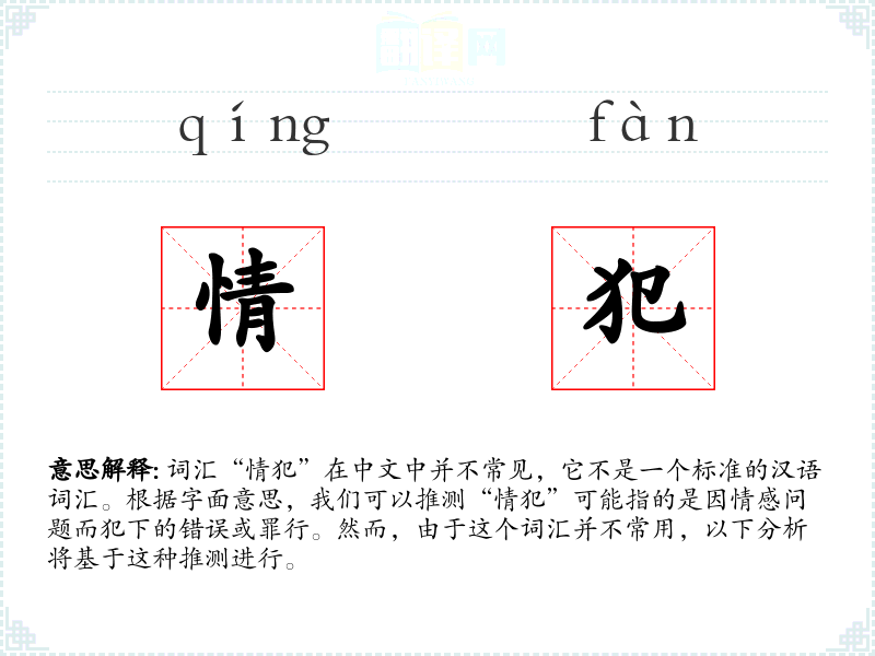 词汇“情犯”在中文中并不常见,它不是一个标准的汉语词汇。根据字面意思,我们可以推测“情犯”可能指的是因情感问题而犯下的错误或罪行。然而,由于这个词汇并不常用,以下分析将基于这种推测进行。