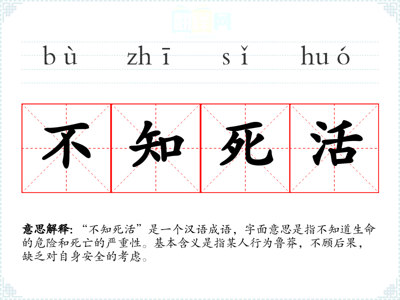 “不知死活”是一个汉语成语,字面意思是指不知道生命的危险和死亡的严重性。基本含义是指某人行为鲁莽,不顾后果,缺乏对自身安全的考虑。