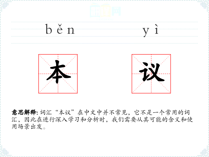 词汇“本议”在中文中并不常见,它不是一个常用的词汇,因此在进行深入学习和分析时,我们需要从其可能的含义和使用场景出发。
