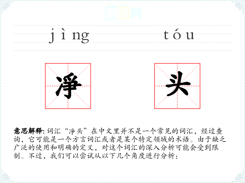由于“凈头”不是一个标准的中文词汇,我们无法给出一个确切的基本定义。它可能是某个地方方言中的词汇,或者是某个行业内部的术语。