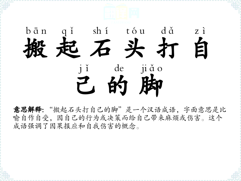 “搬起石头打自己的脚”这个成语深刻地揭示了因果关系和自我伤害的概念。在学*语言和表达时,理解这样的成语不仅有助于丰富词汇,还能帮助我们在生活中做出更明智的决策,避免自食其果。