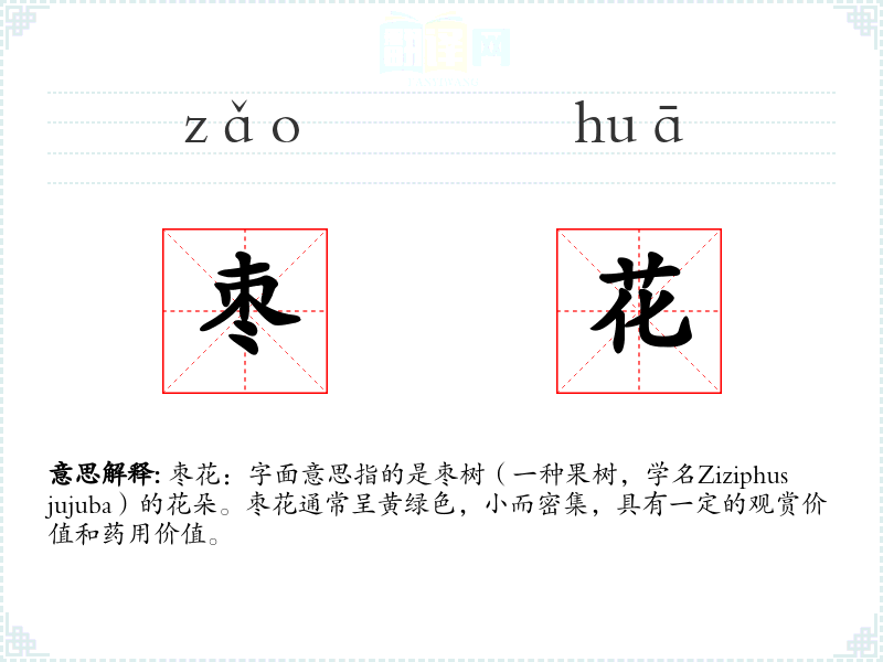 - 口语:在日常对话中,枣花可能被提及作为自然美景的一部分,或是讨论枣树的生长情况。