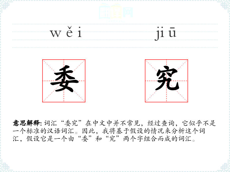 词汇“委究”在中文中并不常见,经过查询,它似乎不是一个标准的汉语词汇。因此,我将基于假设的情况来分析这个词汇,假设它是一个由“委”和“究”两个字组合而成的词汇。