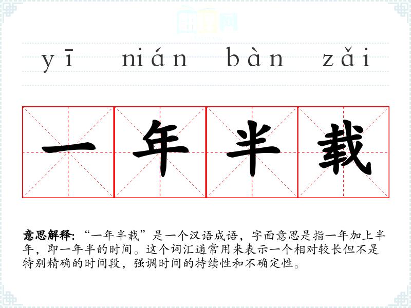 “一年半载”是一个汉语成语,字面意思是指一年加上半年,即一年半的时间。这个词汇通常用来表示一个相对较长但不是特别精确的时间段,强调时间的持续性和不确定性。