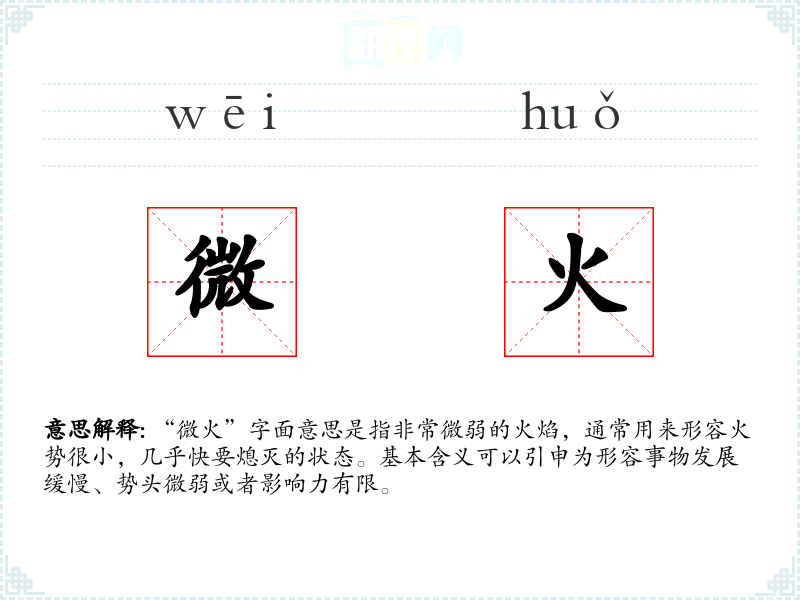 “微火”字面意思是指非常微弱的火焰,通常用来形容火势很小,几乎快要熄灭的状态。基本含义可以引申为形容事物发展缓慢、势头微弱或者影响力有限。