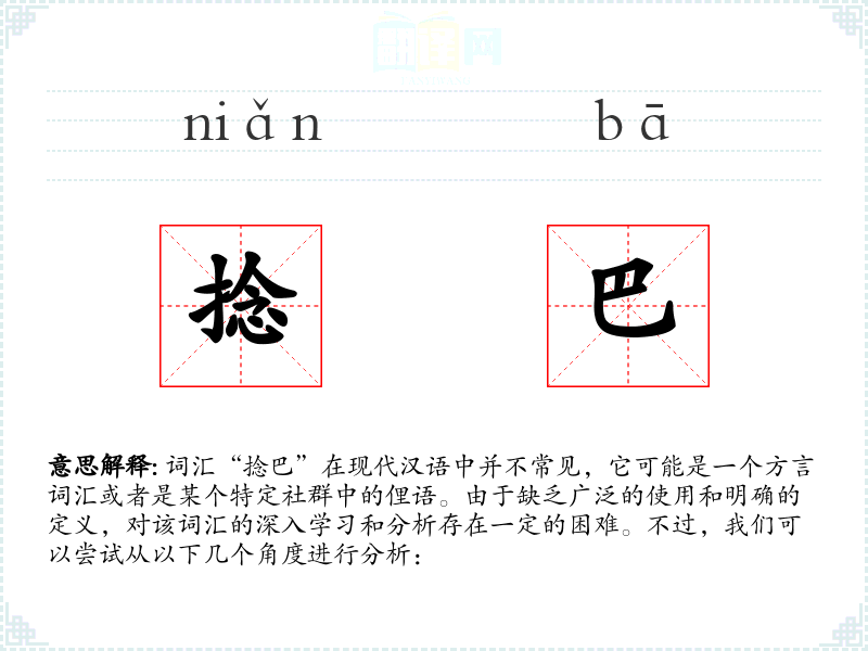 由于“捻巴”不是一个标准汉语词汇,其字面意思和基本含义不明确。可能是指某种动作、状态或者是某个物品的名称。
