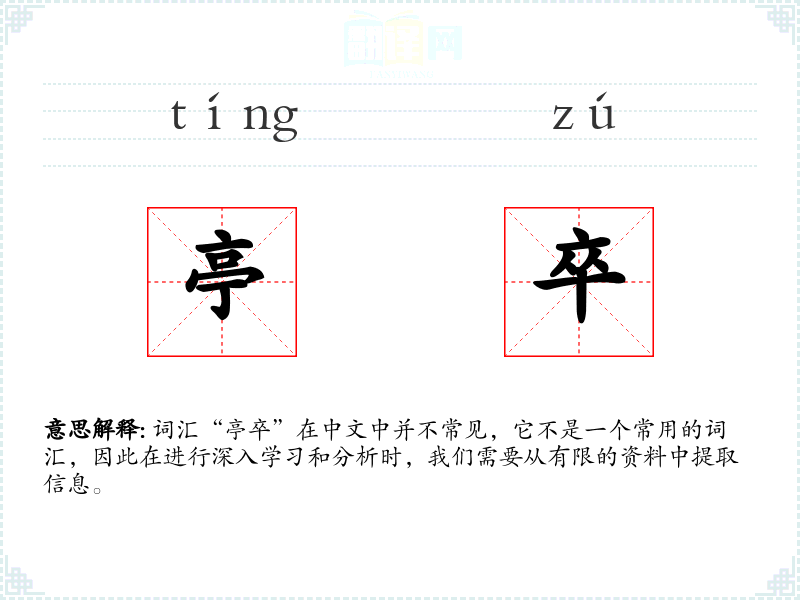 词汇“亭卒”在中文中并不常见,它不是一个常用的词汇,因此在进行深入学*和分析时,我们需要从有限的资料中提取信息。