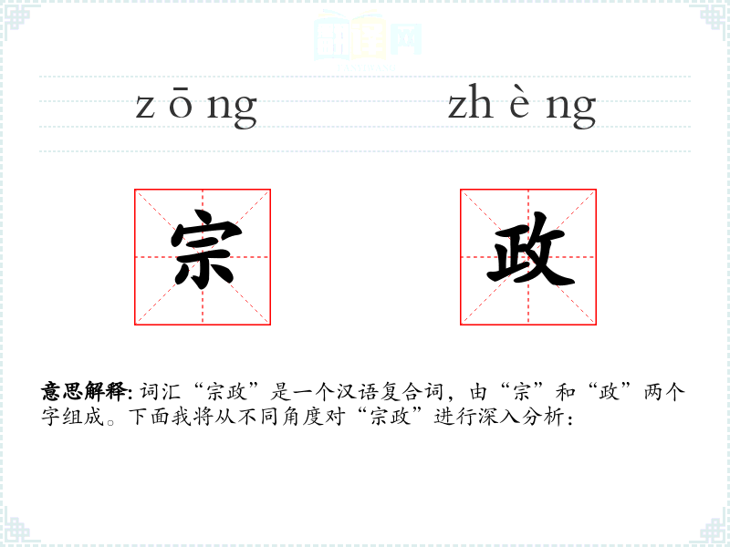 - “宗政”结合来看,可以理解为与宗族或相关的政治事务,或者指宗族或在政治中的地位和作用。