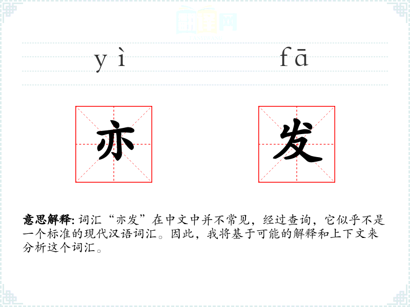 由于“亦发”不是一个标准的现代汉语词汇,我们无法给出一个确切的基本定义。如果强行解释,“亦”通常表示“也”或“同样”,而“发”可以有多种含义,如“发生”、“发展”、“发射”等。因此,“亦发”可能是指“也发生”或“同样发展”的意思,但这只是基于字面意义的推测。
