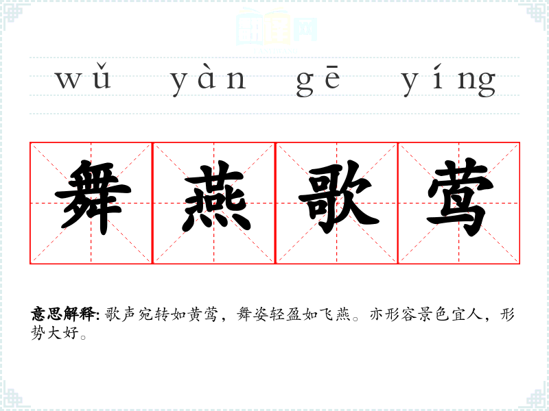 歌声宛转如黄莺,舞姿轻盈如飞燕。亦形容景色宜人,形势大好。