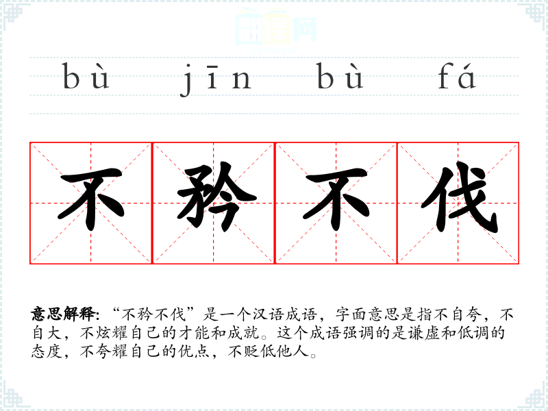 “不矜不伐”是一个汉语成语,字面意思是指不自夸,不自大,不炫耀自己的才能和成就。这个成语强调的是谦虚和低调的态度,不夸耀自己的优点,不贬低他人。