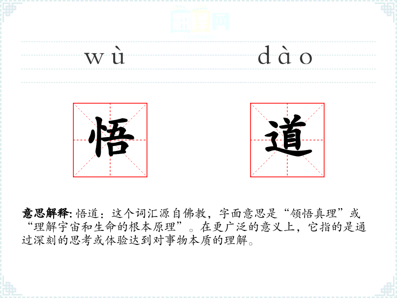 悟道:这个词汇源自**,字面意思是“领悟真理”或“理解宇宙和生命的根本原理”。在更广泛的意义上,它指的是通过深刻的思考或体验达到对事物本质的理解。