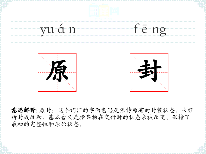 原封:这个词汇的字面意思是保持原有的封装状态,未经拆封或改动。基本含义是指某物在交付时的状态未被改变,保持了最初的完整性和原始状态。