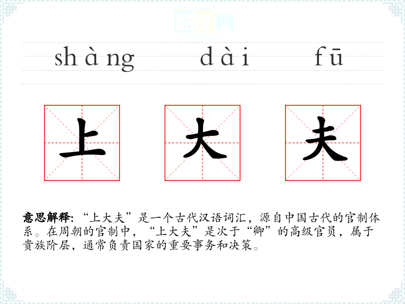 “上大夫”是一个古代汉语词汇,源自**古代的官制体系。在周朝的官制中,“上大夫”是次于“卿”的高级官员,属于贵族阶层,通常负责国家的重要事务和决策。