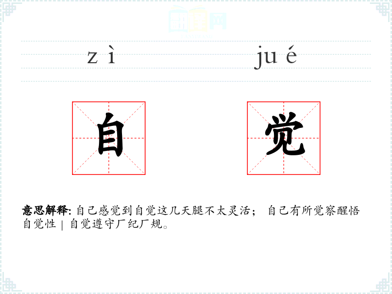 自己感觉到自觉这几天腿不太灵活; 自己有所觉察醒悟自觉性|自觉遵守厂纪厂规。
