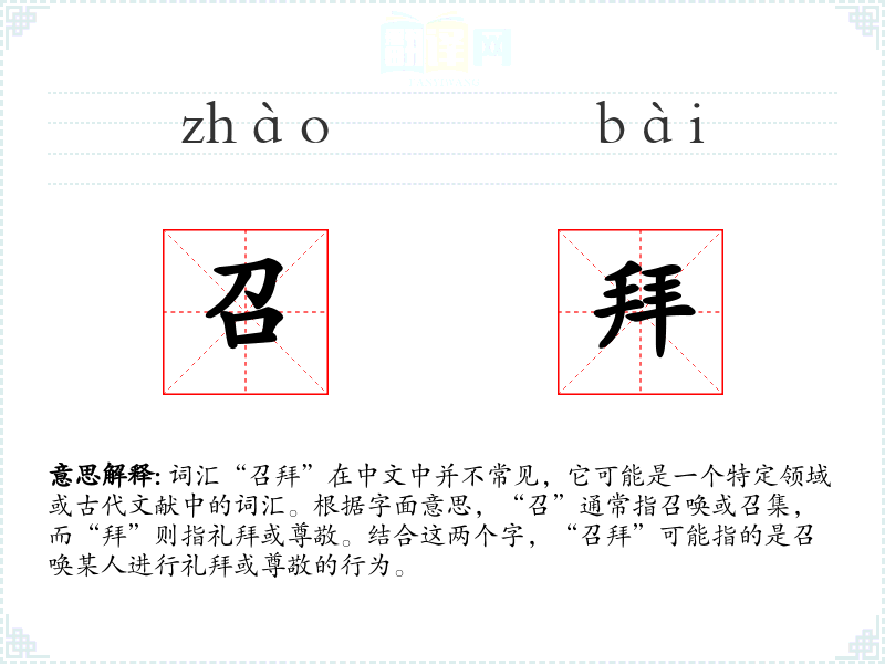 - 理解:“召拜”是一个具有特定历史和文化背景的词汇,虽然在现代语言中不常见,但在研究古代社会和**时具有重要意义。