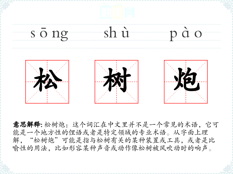 松树炮:这个词汇在中文里并不是一个常见的术语,它可能是一个地方性的俚语或者是特定领域的专业术语。从字面上理解,“松树炮”可能是指与松树有关的某种装置或工具,或者是比喻性的用法,比如形容某种声音或动作像松树被风吹动时的响声。