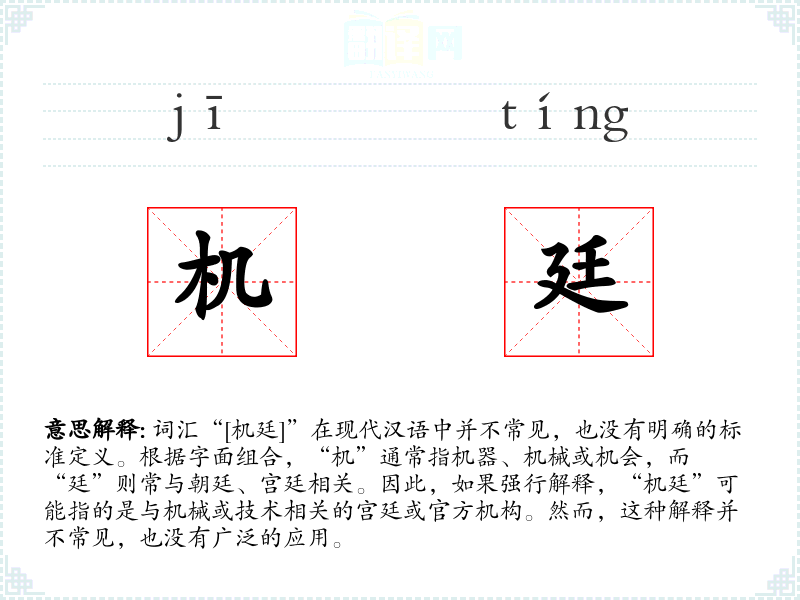 由于“[机廷]”不是一个标准词汇,我们无法提供一个确切的基本定义。它可能是一个特定领域或方言中的词汇,或者是某个特定文献中的创造性用法。