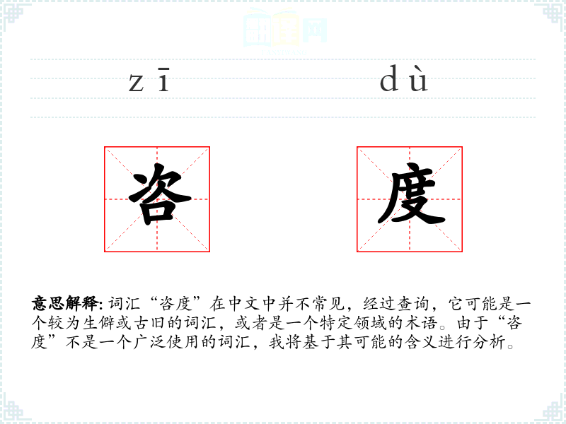 词汇“咨度”在中文中并不常见,经过查询,它可能是一个较为生僻或古旧的词汇,或者是一个特定领域的术语。由于“咨度”不是一个广泛使用的词汇,我将基于其可能的含义进行分析。