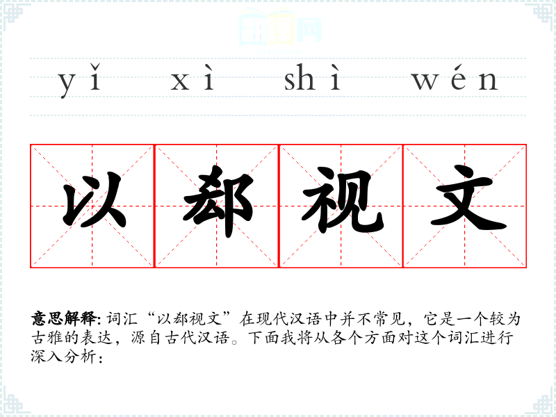 “以郄视文”是一个富有文化底蕴的词汇,虽然在现代汉语中不常用,但它体现了语言的丰富性和历史的深度。在学习和使用这个词汇时,可以增加对古代文化和语言的理解。