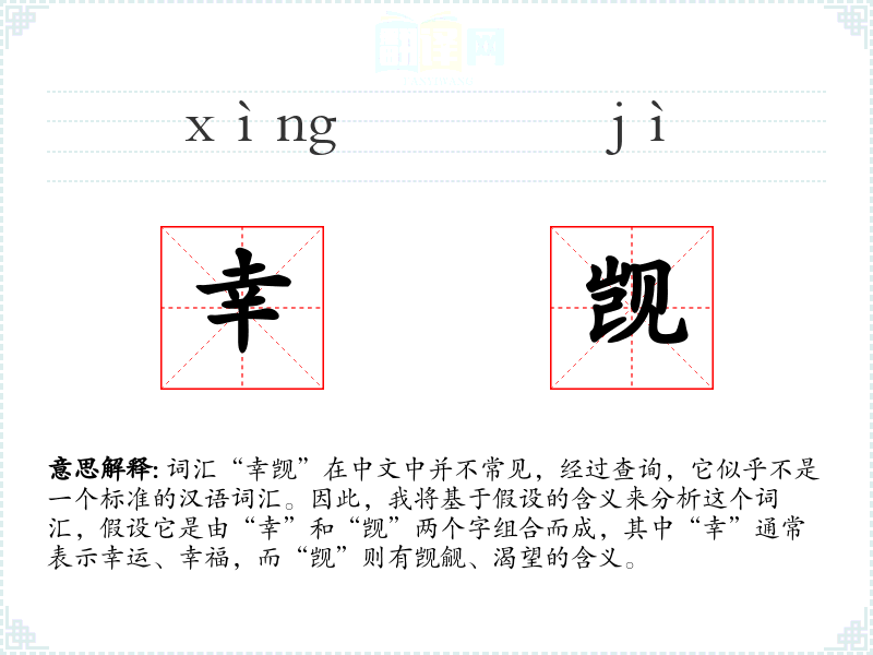 词汇“幸觊”在中文中并不常见,经过查询,它似乎不是一个标准的汉语词汇。因此,我将基于假设的含义来分析这个词汇,假设它是由“幸”和“觊”两个字组合而成,其中“幸”通常表示幸运、幸福,而“觊”则有觊觎、渴望的含义。