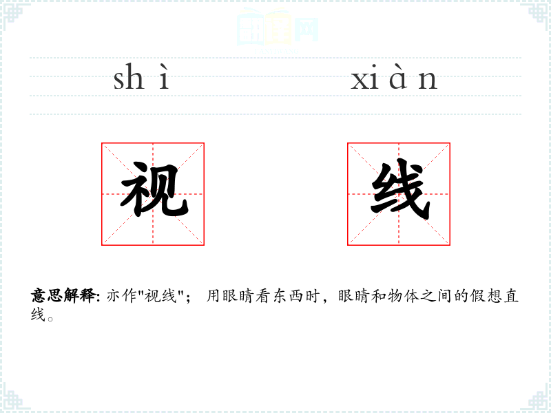 亦作"视线"; 用眼睛看东西时,眼睛和物体之间的假想直线。