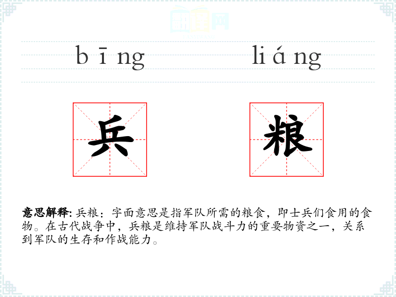 - 反义词:无(兵粮本身是一个特定的军事术语,没有直接的反义词)