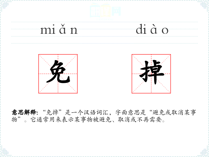 “免掉”由“免”和“掉”两个字组成。“免”字古已有之,意为避免或免除;“掉”字则有去除或消失的含义。两者结合,形成了“免掉”这一词汇,表示某事物被避免或取消。