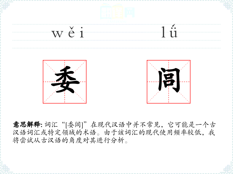 词汇“[委闾]”在现代汉语中并不常见,它可能是一个古汉语词汇或特定领域的术语。由于该词汇的现代使用频率较低,我将尝试从古汉语的角度对其进行分析。