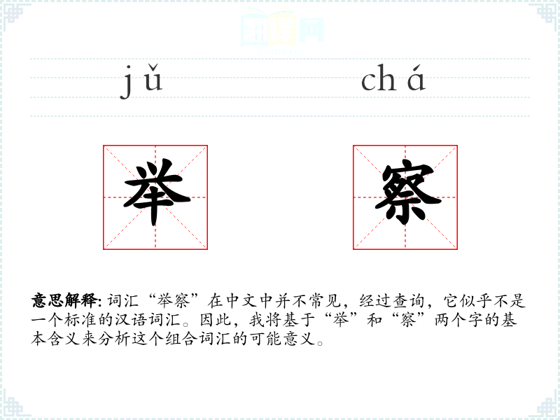 词汇“举察”在中文中并不常见,经过查询,它似乎不是一个标准的汉语词汇。因此,我将基于“举”和“察”两个字的基本含义来分析这个组合词汇的可能意义。
