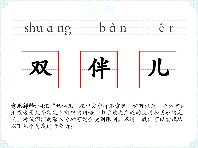 词汇“双伴儿”在中文中并不常见,它可能是一个方言词汇或者是某个特定社群中的用语。由于缺乏广泛的使用和明确的定义,对该词汇的深入分析可能会受到限制。不过,我们可以尝试从以下几个角度进行分析: