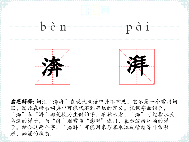 - “渀湃”是一个形容强烈动态场景的词汇,虽然在现代汉语中不常用,但在文学创作或特定专业领域中可能会有其独特的应用价值。学习和理解这样的生僻词汇,可以丰富语言表达的层次和深度。