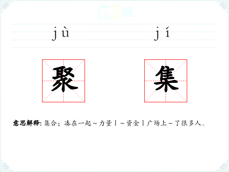 集合;凑在一起~力量ㄧ~资金ㄧ广场上~了很多人。