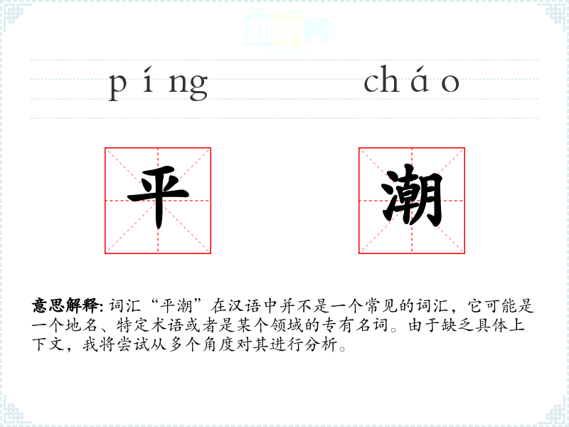 词汇“平潮”在汉语中并不是一个常见的词汇,它可能是一个地名、特定术语或者是某个领域的专有名词。由于缺乏具体上下文,我将尝试从多个角度对其进行分析。