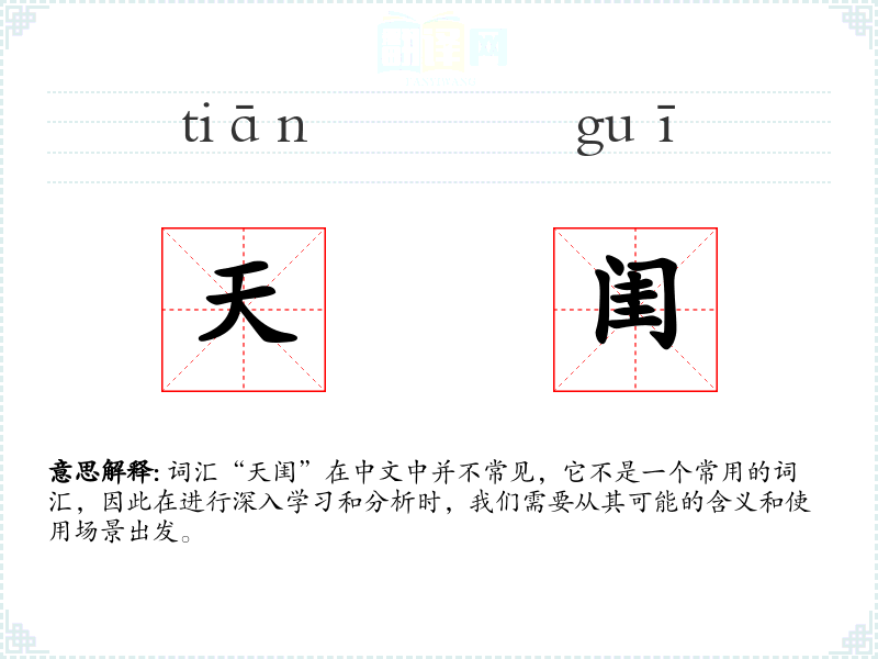 - 反义词:尘世、人间(这些词汇与“天闺”形成对比,指的是现实世界或世俗生活)