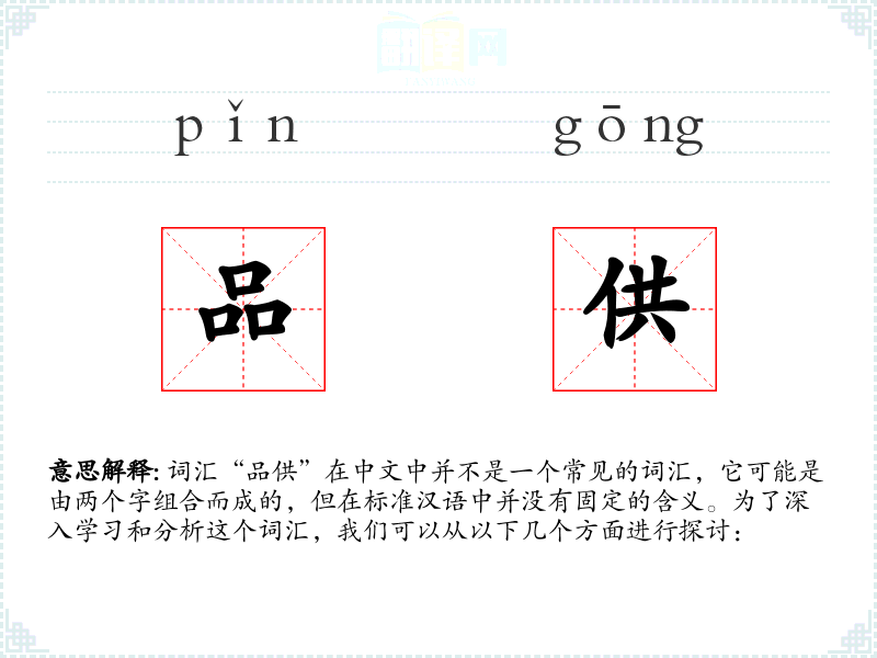 词汇“品供”在中文中并不是一个常见的词汇,它可能是由两个字组合而成的,但在标准汉语中并没有固定的含义。为了深入学习和分析这个词汇,我们可以从以下几个方面进行探讨: