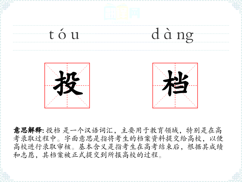 投档 一词源于汉语,由“投”和“档”两个字组成。在古代汉语中,“投”有提交、投入的意思,“档”则指档案、记录。随着现代教育制度的发展,这个词在高考录取流程中被广泛使用。
