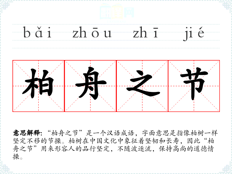 “柏舟之节”是一个汉语成语,字面意思是指像柏树一样坚定不移的节操。柏树在**文化中象征着坚韧和长寿,因此“柏舟之节”用来形容人的品行坚定,不随波逐流,保持高尚的道德情操。