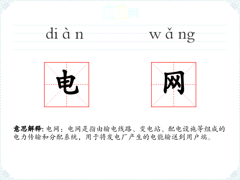 - 词源:电网一词由“电”和“网”组成,其中“电”指电力,“网”指网络或系统。