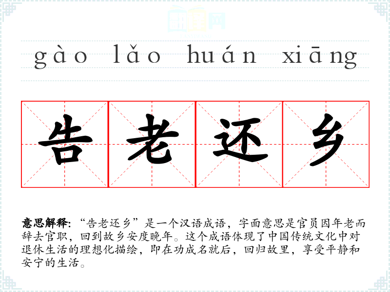 “告老还乡”是一个汉语成语,字面意思是官员因年老而辞去官职,回到故乡安度晚年。这个成语体现了**传统文化中对退休生活的理想化描绘,即在功成名就后,回归故里,享受平静和安宁的生活。