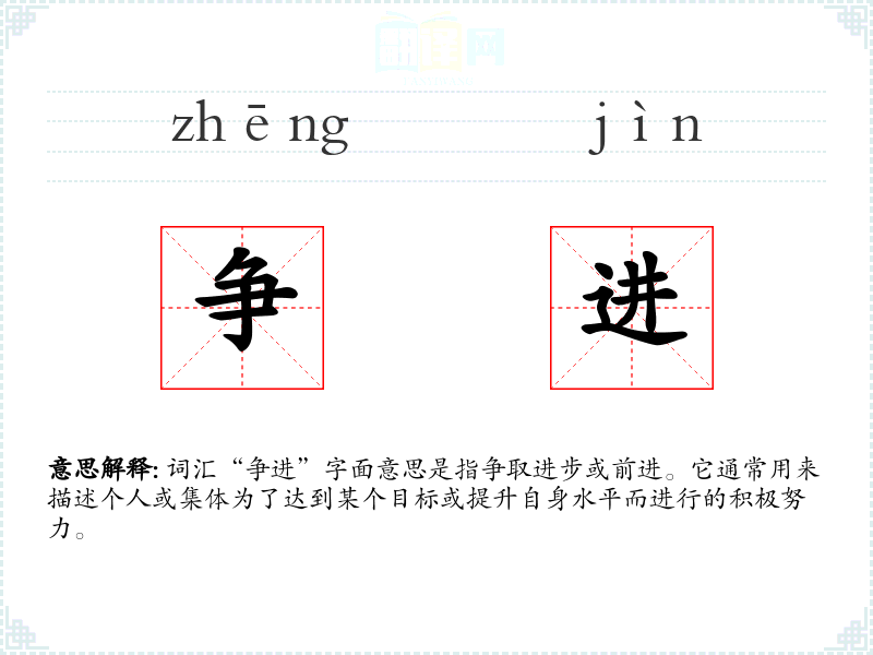 “争进”一词由“争”和“进”两个字组成。“争”字古已有之,意为争夺、争取;“进”字则表示前进、进步。两者结合,形成了表示积极争取进步的含义。