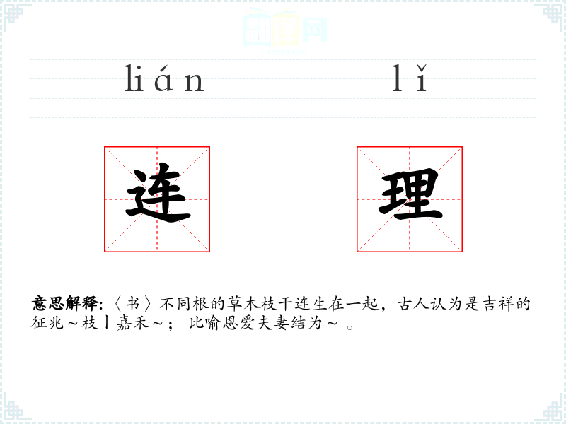 〈书〉不同根的草木枝干连生在一起,古人认为是吉祥的征兆~枝ㄧ嘉禾~; 比喻