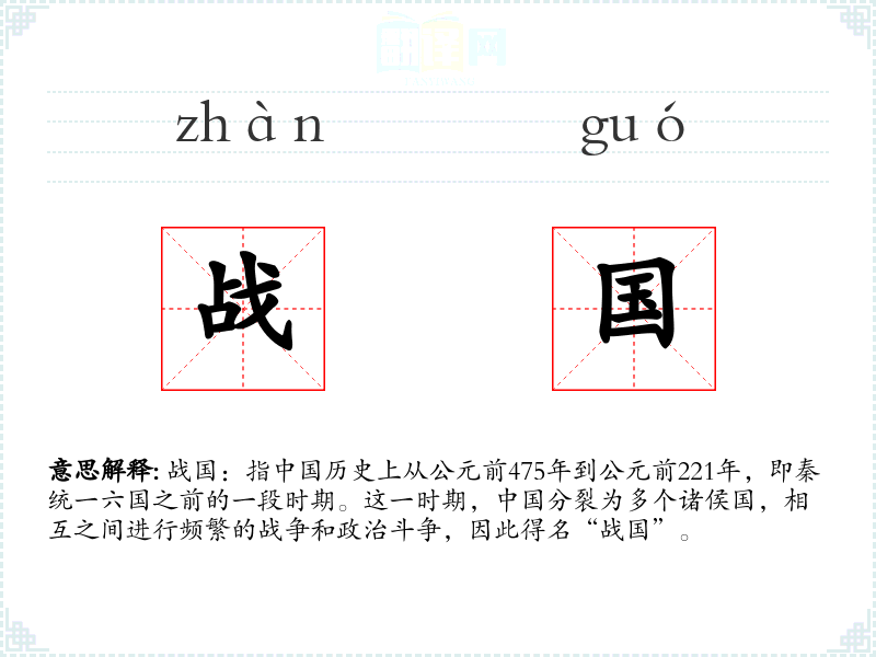 战国:指历史上从公元前475年到公元前221年,即秦统一六国之前的一段时期。这一时期,分裂为多个诸侯国,相互之间进行频繁的战争和政治斗争,因此得名“战国”。
